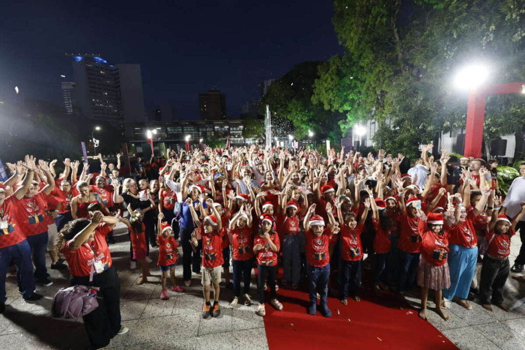 O Governo do Ceará realizou o Natal Ceará Sem Fome, ocasião em que o governador Elmano de Freitas e a primeira-dama e presidente do Comitê Intersetorial de Governança do Programa Ceará Sem Fome, Lia de Freitas, recepcionaram 500 crianças beneficiadas pelo programa e tuteladas pela Secretaria da Proteção Social, no Palácio da Abolição, em Fortaleza. O evento aconteceu na noite desta sexta-feira, dia 19 de dezembro.
