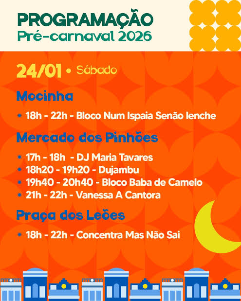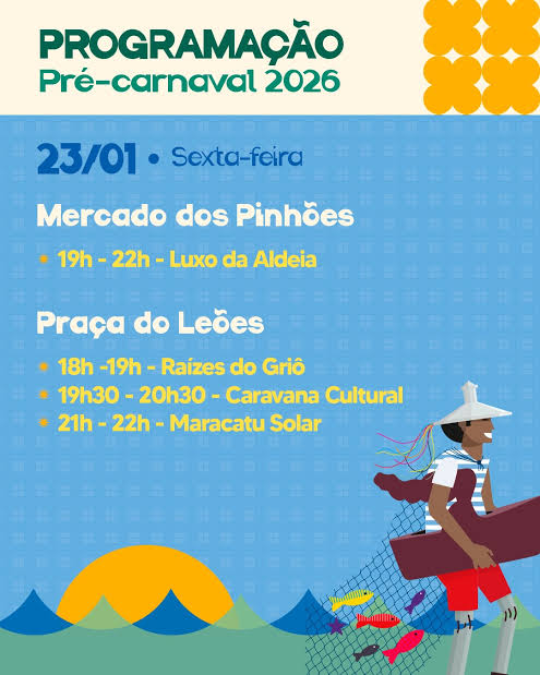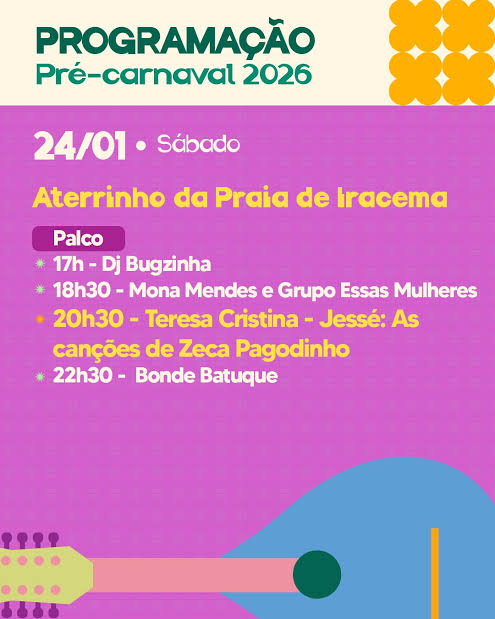 O Pré-Carnaval de Fortaleza tem sequência no próximo fim de semana com a oferta de shows gratuitos em vários polos da Capital. A programação foi divulgada pela Secretaria de Cultura de Fortaleza e tem início já na sexta-feira, dia 23 de janeiro, com atrações no Mercado dos Pinhões, na Praia de Iracema, e Praça dos Leões, no Centro, a partir das 18 horas.