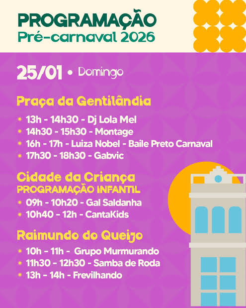O domingo também reserva muita folia no Centro de Fortaleza. O Polo Raimundo dos Queijos terá três shows, a partir das 10 horas, com Grupo Murmurando, Samba de Rosa e Banda Frevilhando, de Sobral. Ainda há programação carnavalesca na Praça da Gentilândia, no Benfica, e Cidade da Criança, no Centro.